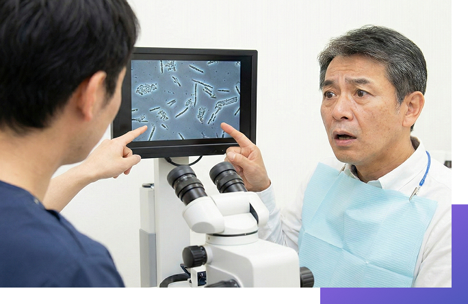 位相差顕微鏡で菌を確認することで、患者は「自分の口の中は感染症なんだ」と自分事化します。
